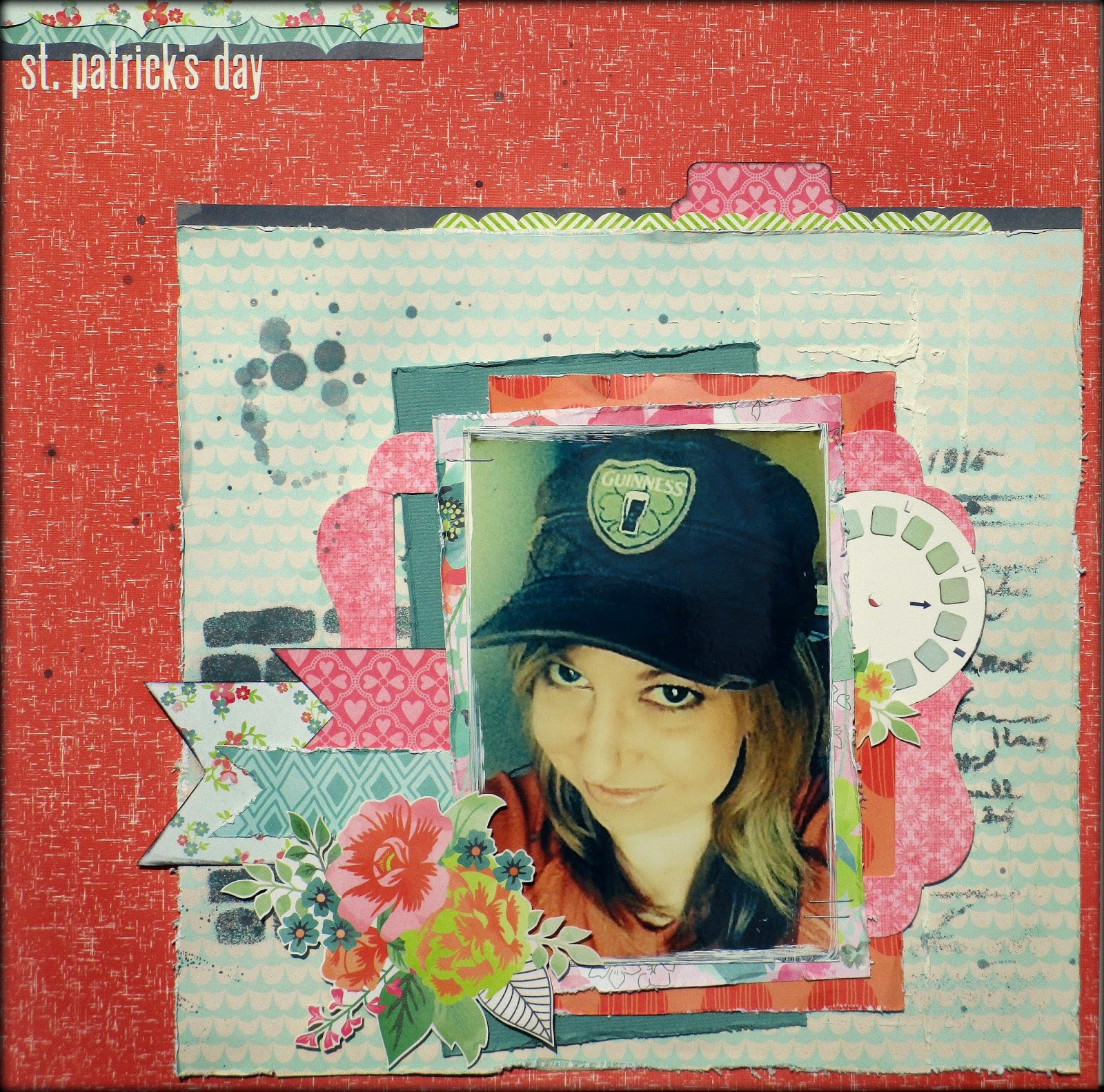 Challenge #17 is to create a layout using a selfie photo and to use a premade/packaged frame from our stash. I used a selfie of myself that I took on St. Patrick's Day this year. Back before kids I usually celebrated by drinking a Guinness (or two...or three lol), but since I've had little one(s) home with me for the last six years, now I opt for just wearing my Guinness cap. Since I created this page for Scrap Our Stash, it seemed like I ought to use as much older product & scraps as possible. My background paper is Scribble Scrabble...is that manufacturer even still in business?? And the scraps are from Basic Grey Fresh Cut, Crate Paper Love Notes and Bo Bunny Modern Miss. For the frame I dug into my stash and found a pink one from My Mind's Eye Just Dreamy 2. I cut it in half and tucked it behind the layers to give an illusion of it being much longer than it actually is.